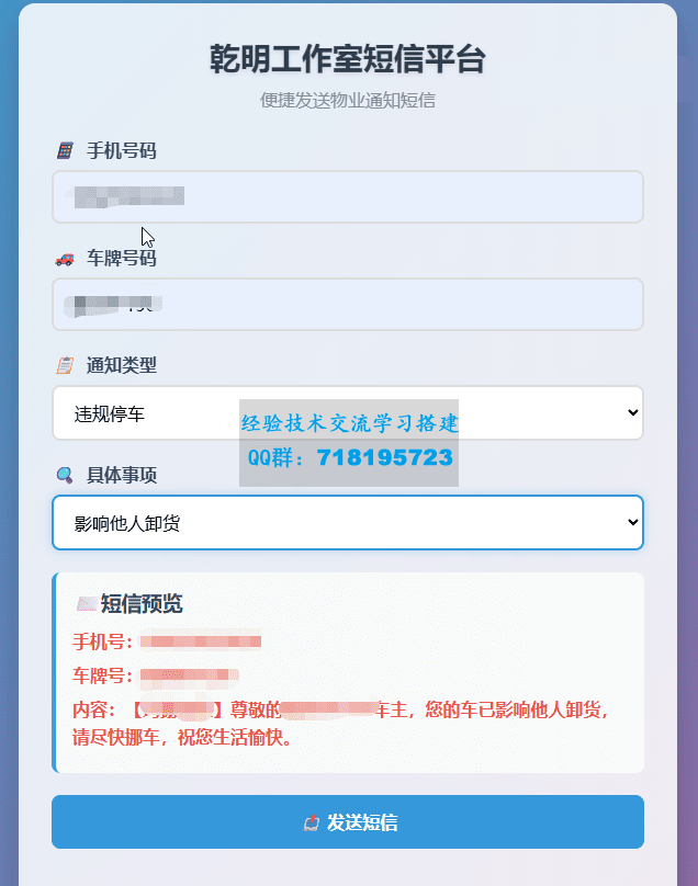 会员:千手观音分享的:物业管理短信发送系统 HTML源码 1.查找 关键词 XX物业 更改为你的公司名称2.短信模板报备(需提前到短信宝VIP报备)【XX物业】尊敬的{var}车主,您的免登车牌申请未通过,驳回原因:近30天进出园区记录未超过50条。【XX物业】尊敬的{var}车 仅供参考研究交流