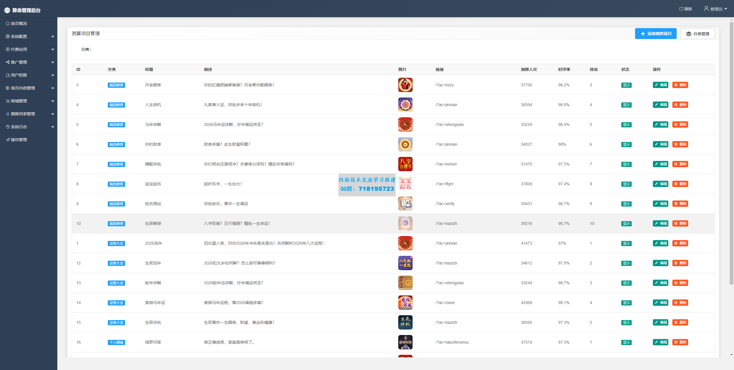 会员:洪七公分享的:2026马年新版测算系统源码 详情介绍 2026年更新后台框架改用layui 更加稳定 美观前端首页后台可控制项目 图片新增商城功能更新马年运势模板/八字神煞/八字终身运/新增塔罗问答模 仅供参考研究交流