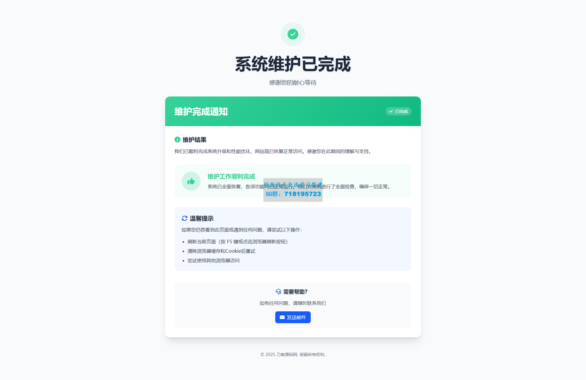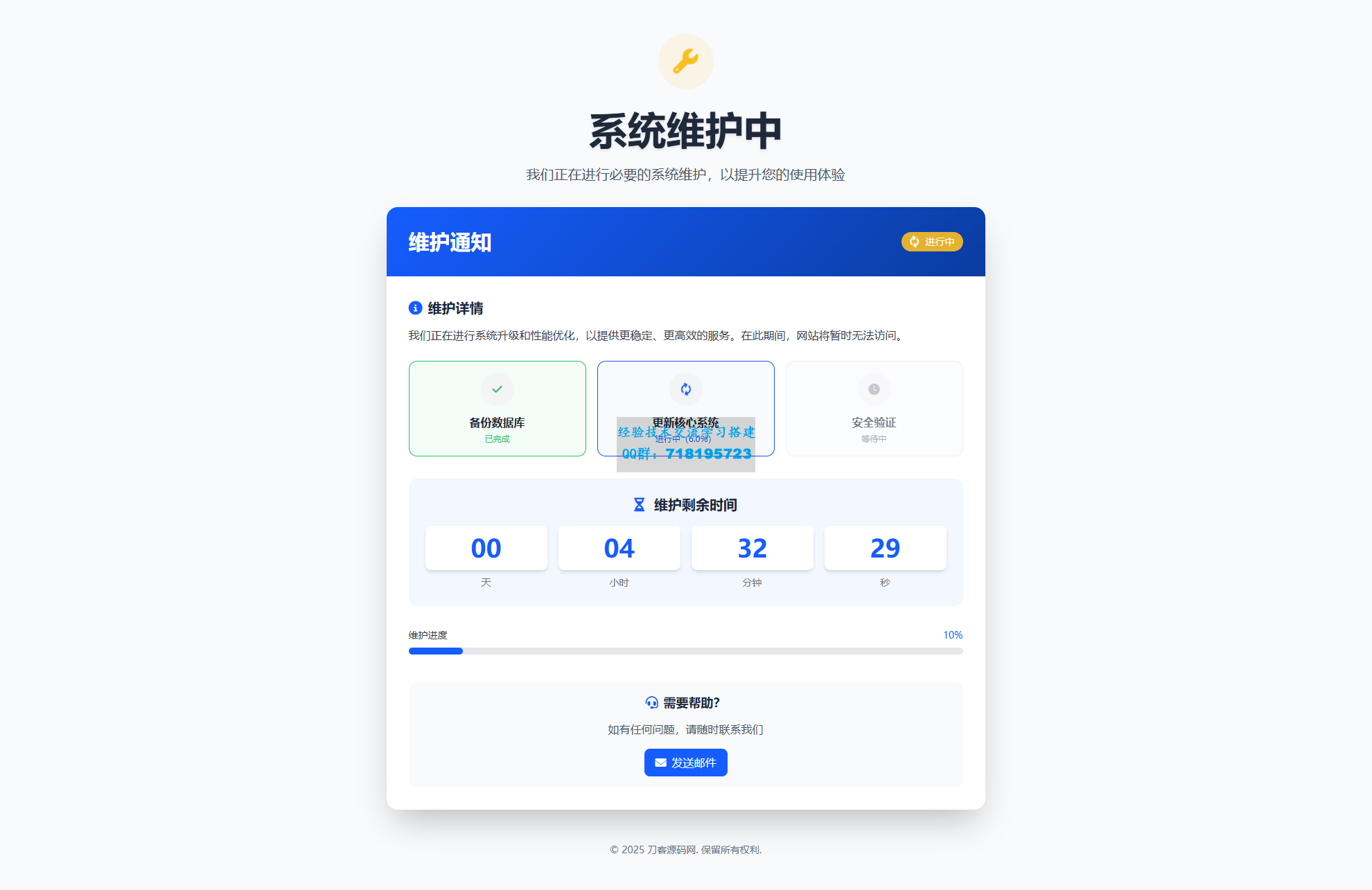 自适应手机和电脑端,页面简洁美观,有三个页面,维护前、维护中、维护完,无后台,内容在首页index文件修改